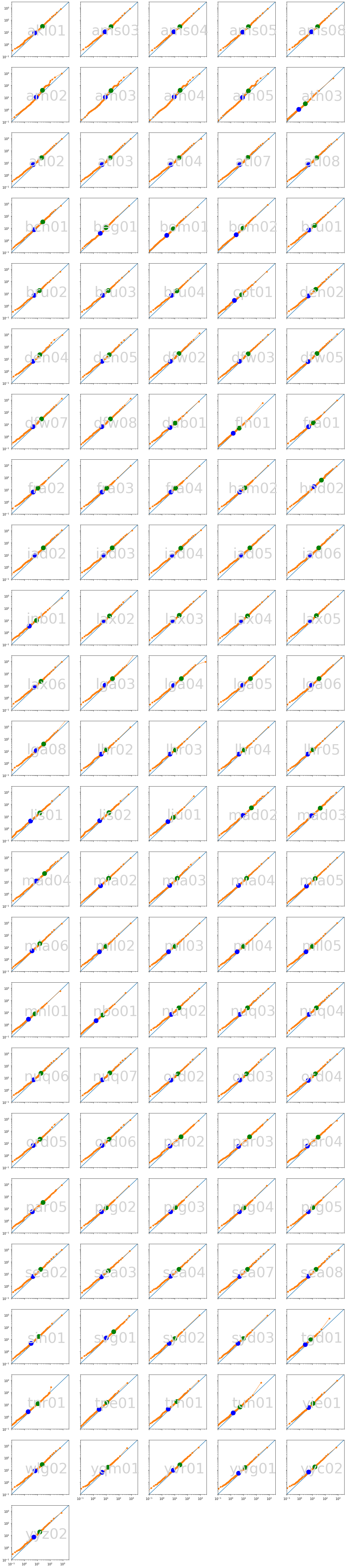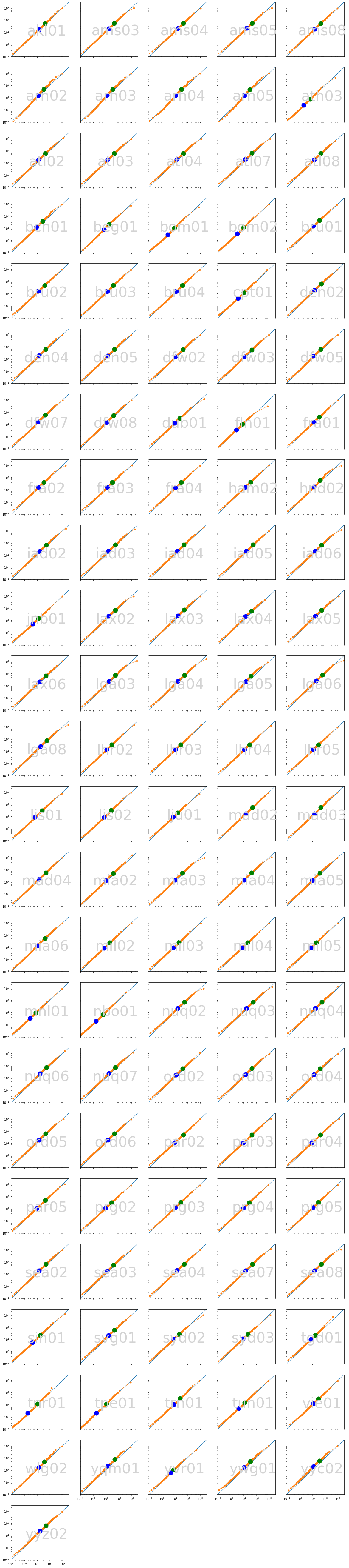 def plot_small_multiples(decile, average, log_average): import math import matplotlib.pyplot as plt columns = 5 rows = math.ceil(len(decile) / float(columns)) plt.rcParams['figure.figsize'] = [20,4*rows] for i, site in enumerate(sorted(decile)): current = plt.subplot(rows, columns, i+1) top = 3000 plt.loglog(range(int(top+2)), range(int(top+2))) plt.text(top**.5, top**.5/10, site, ha='center', fontsize=48, color='lightgray') plt.loglog(decile[site]['web100'], decile[site]['tcpinfo'], label=site, linewidth=1, marker=".", markersize=10) plt.loglog([average[site]['web100']], [average[site]['tcpinfo']], color='green', marker=".", markersize=30) plt.loglog([log_average[site]['web100']], [log_average[site]['tcpinfo']], color='blue', marker=".", markersize=30) plt.xlim(left=.1, right=3000) plt.ylim(bottom=.1, top=3000) plt.setp(current.get_xticklabels(), visible=(i+columns >= len(decile))) plt.setp(current.get_yticklabels(), visible=((i%columns) == 0))
