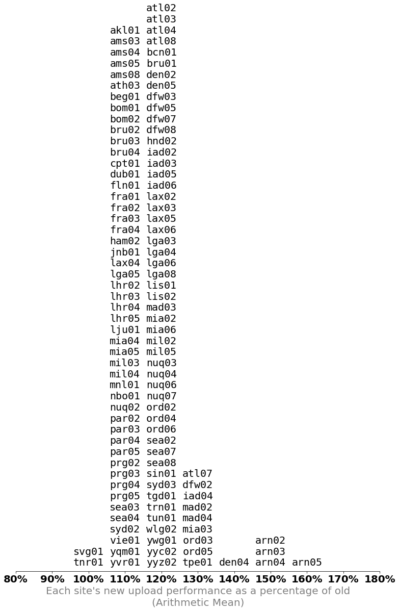 Hooray! Nothing is worse with the uploads, either! Because no mean at any site for uploads or downloads has gotten worse, it is safe to conclude that the new platform is not worse than the old platform, and that we should feel confident in rolling it out gradually to the rest of the fleet. M-Lab 2.0 is good to go and is safe to be rolled out.