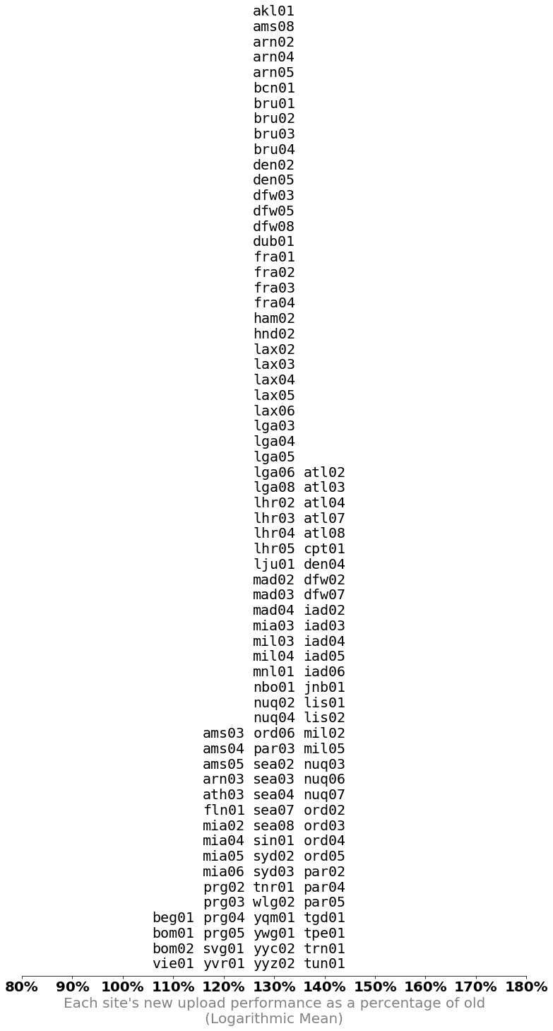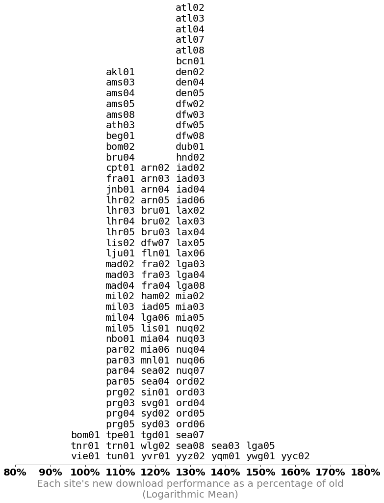 Because our data spans multiple orders of magnitude, we calculate a histogram of per-site improvement using both the arithmetic mean as well as the logarithmic mean and see what sites have improved, and what sites have gotten worse, in an effort to answer the question: “Are the new sites worse than the old sites?”