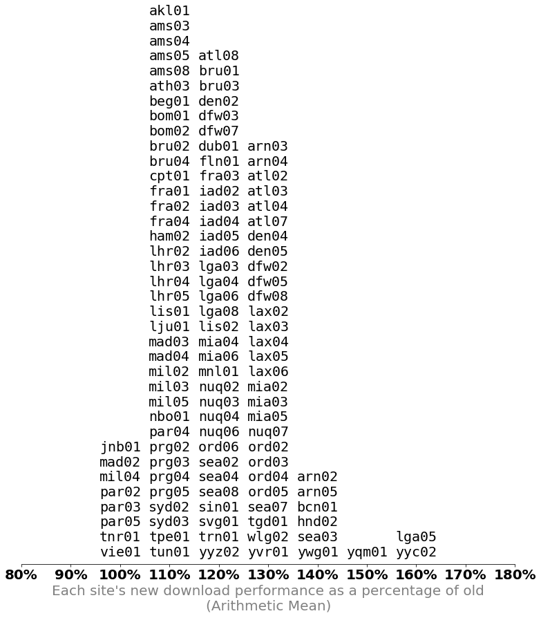 plt.show()print_histogram(average, "Each site's new download performance as a percentage of old\n(Arithmetic Mean)")print()print_histogram(log_average, "Each site's new download performance as a percentage of old\n(Logarithmic Mean)")